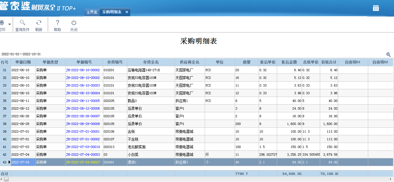 使用管家婆软件,录入单据后,系统会自动生成报表,一键查看进货的仓库、数量以及金额,真正到货后,该商品库存数量会自动增加,无需手动修改,一键查看采购明细。