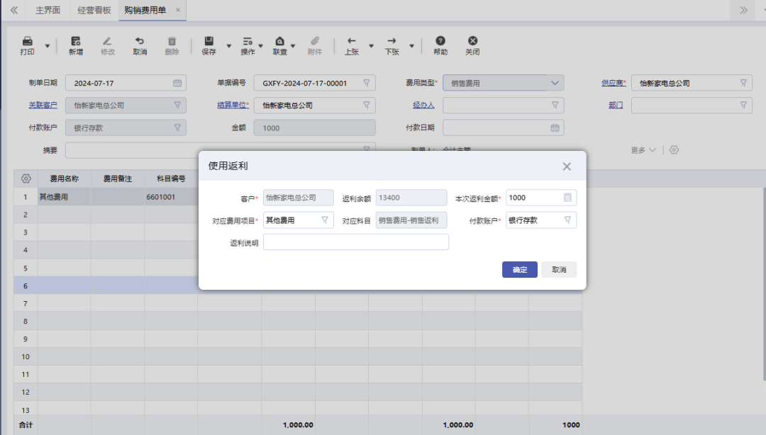 ③ 返现,通过购销费用单(销售费用)—操作—使用返利来处理。