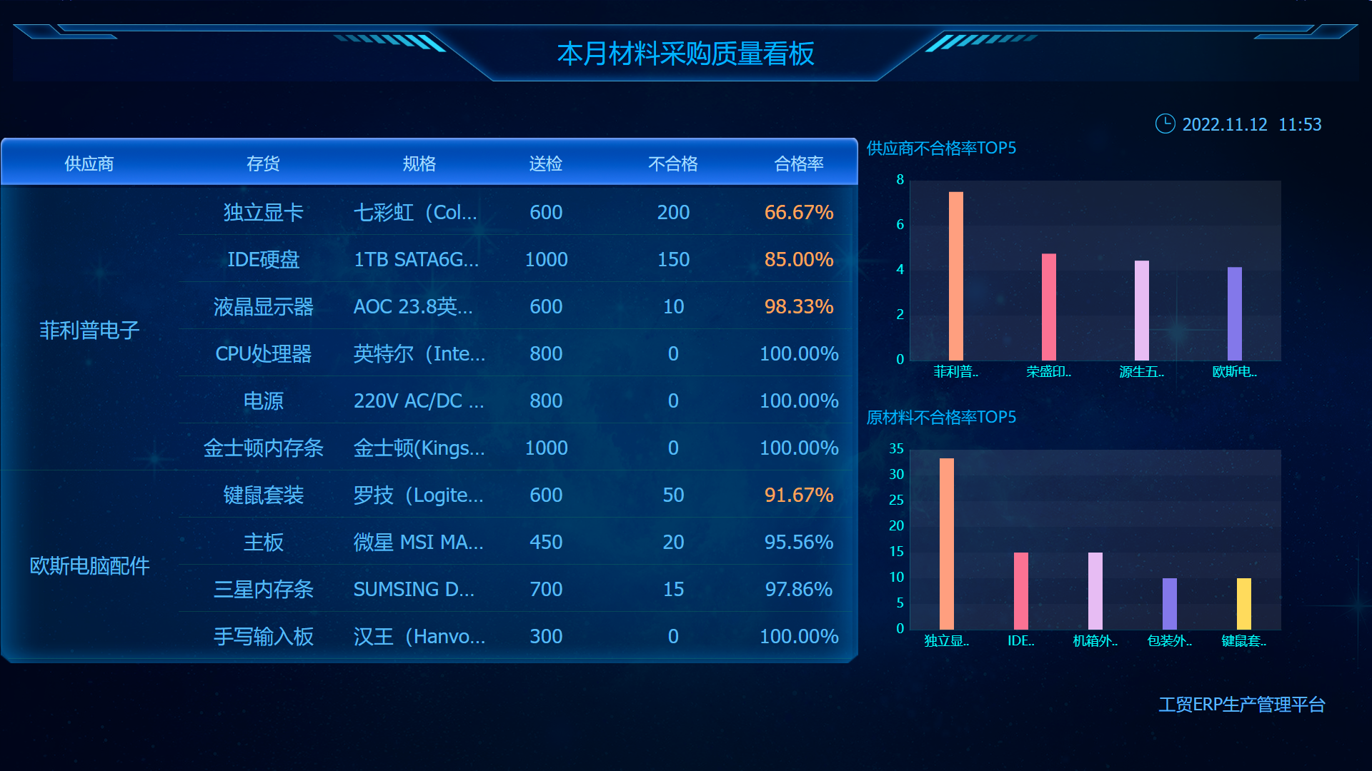 管家婆工贸系列数字化管理平台集生产、采购、销售、库存、财务管理于一体,通过与车间掌上MES的搭配,及时、高效地实现车间各类数据采集。同时,平台也能将采集到的生产及质量信息实时反馈到系统的各看板、SPC和统计报表中,利用可视化的方式获取实时生产指标和分析,使得管理者在第一时间掌握车间的物料、生产进度、质量情况,为管理者的决策提供数据支持。