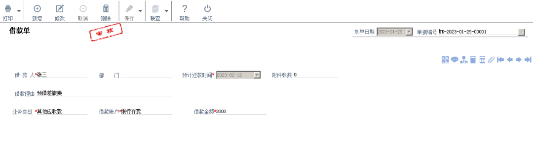 2、在“借款单”中,借款人选择,借款理由输入“预借差旅费”,业务类型选择“其他应收款”(需提前新增),借款账户选择对应支付账户,输入对应的借款金额,如图1所示,对应凭证如图2所示。