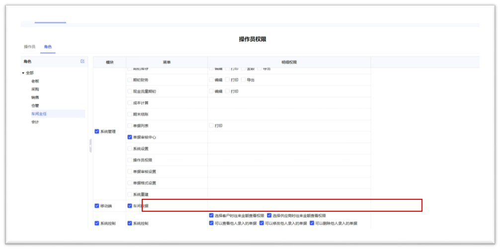 ②如何启用系统管理>操作员权限>角色 勾选小程序模块车间数据菜单。