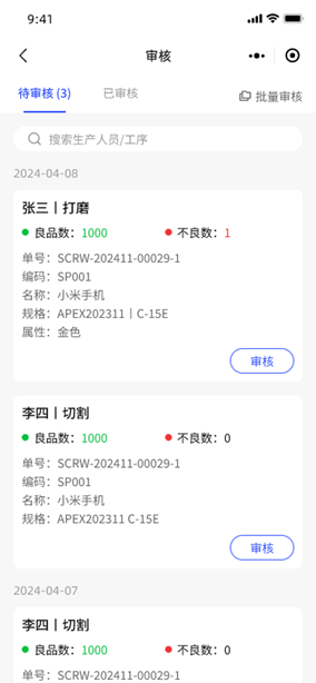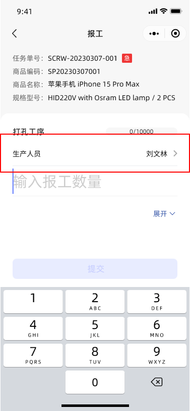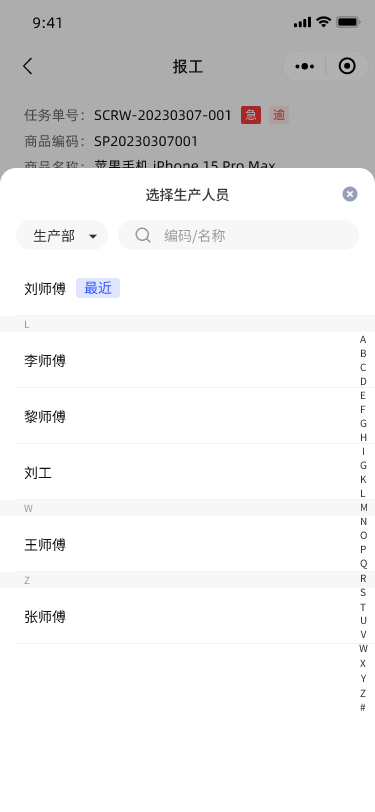 应用场景:很多车间里面班组长没有电脑,不能用报工工作台进行批量报工,就需要班组长用手机来进行帮员工报工,报工时增加了选择生产人员。